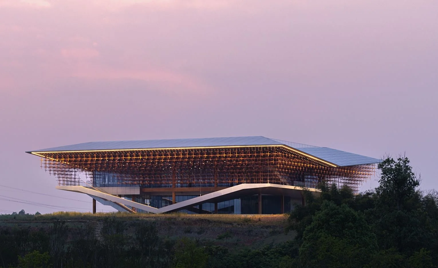 Inspired by a wild goose taking flight, the building blends into its natural surroundings using materials such as bamboo and glass curtain walls.